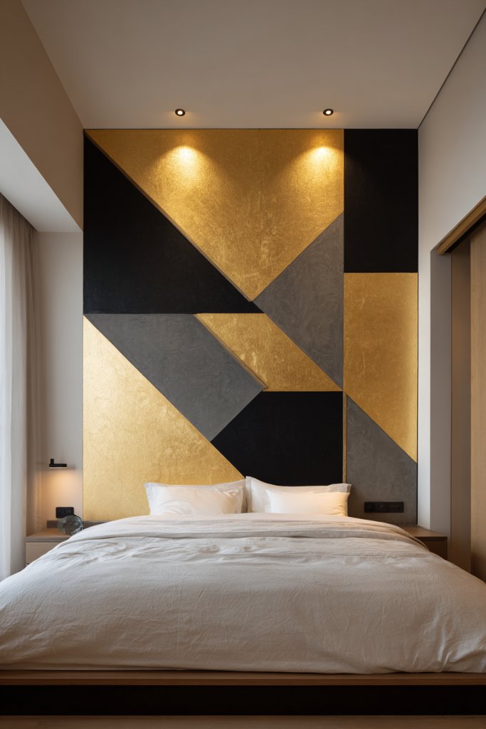 A statement geometric wall elevates your bedroom into a modern art gallery. It’s a bold choice that shows off your design chops and confidence. Ready to turn your wall into a conversation starter? This idea is both striking and adaptable to your personal style.