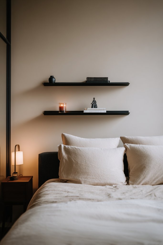 Imagine a series of floating shelves arranged in varying lengths and heights behind your bed. The shelves hold decorative boxes, candles, or framed photos—carefully curated to reflect your personality. The layered effect adds visual interest, creating a sense of depth and dimension. This setup combines functionality with a chic, modern look.