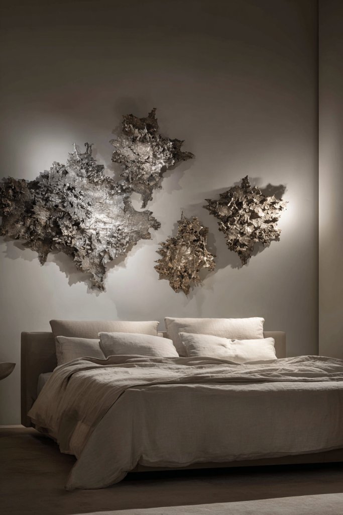 Looking to add a sense of movement and dimension that truly stands out? 3D wall art with sculptural elements injects boldness and artistry into your bedroom. It’s perfect for creating a statement wall that feels alive and dynamic. Plus, it’s a conversation starter that showcases your bold decorating taste.