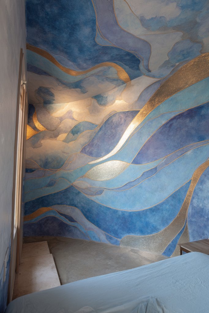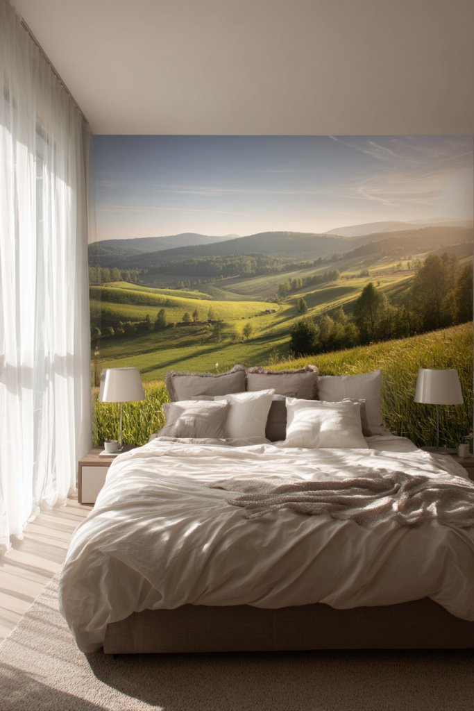 Visualize a large, painted mural spanning the wall behind your bed—think sweeping landscapes, bold abstract shapes, or intricate geometric patterns. The layered effect adds depth, making the scene feel immersive. Use vibrant colors or monochrome palettes to match your mood. The textured brushstrokes or layered paint create visual richness that captures attention and sets the room’s tone.