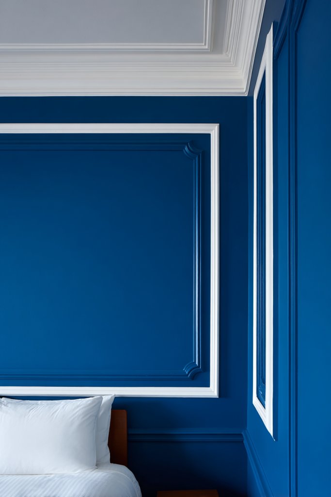 Picture a deep navy or emerald green wall framed with crisp white or gold trim. The molding creates a layered effect, adding depth and dimension. Light from bedside sconces reflects off the painted surface, highlighting the richness of the color. The contrast makes the space feel curated and intentional, like a boutique hotel suite.