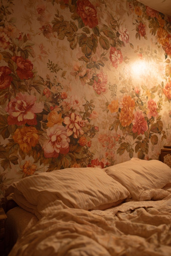 Imagine a wall covered in floral or geometric vintage wallpaper, reminiscent of mid-century or Victorian styles. The patterns add visual interest and personality, making the space feel curated and warm. Pair with antique-inspired furniture, layered textiles, and warm lighting for a full retro aesthetic. The textured surfaces and patterns create a rich, inviting backdrop.