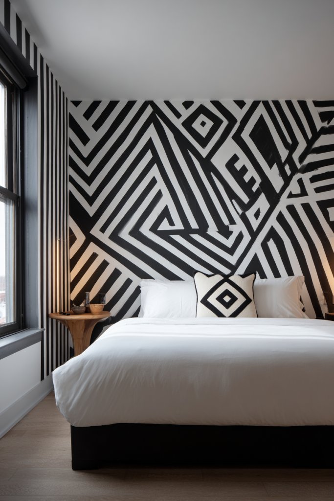 Choose patterns that match your personality—sharp lines for a minimalist vibe or softer curves for a more organic feel. You can opt for wallpaper with bold prints or use painter’s tape and high-contrast paint for a DIY approach. For smaller spaces, consider a partial feature, like a band across the headboard. Seasonal color swaps or metallic accents can also refresh the look.