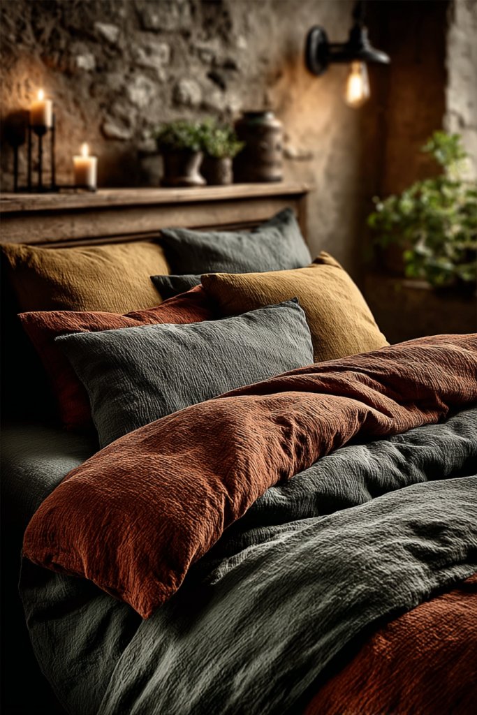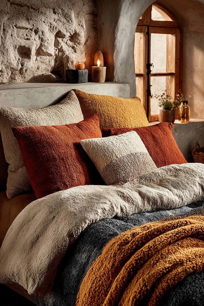 Imagine a bed dressed in warm, earthy sheets layered with textured pillows in similar hues. The fabric feels soft and inviting, perfect for cuddling. Layering pillows in different sizes and textures adds depth and personality. The overall look is calming, organic, and effortlessly stylish.
