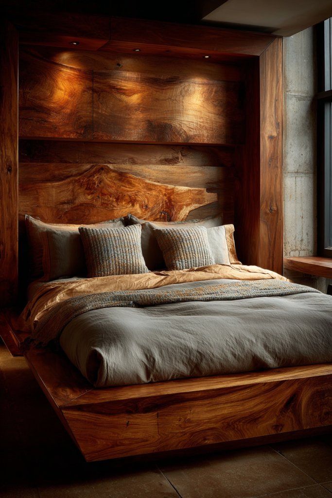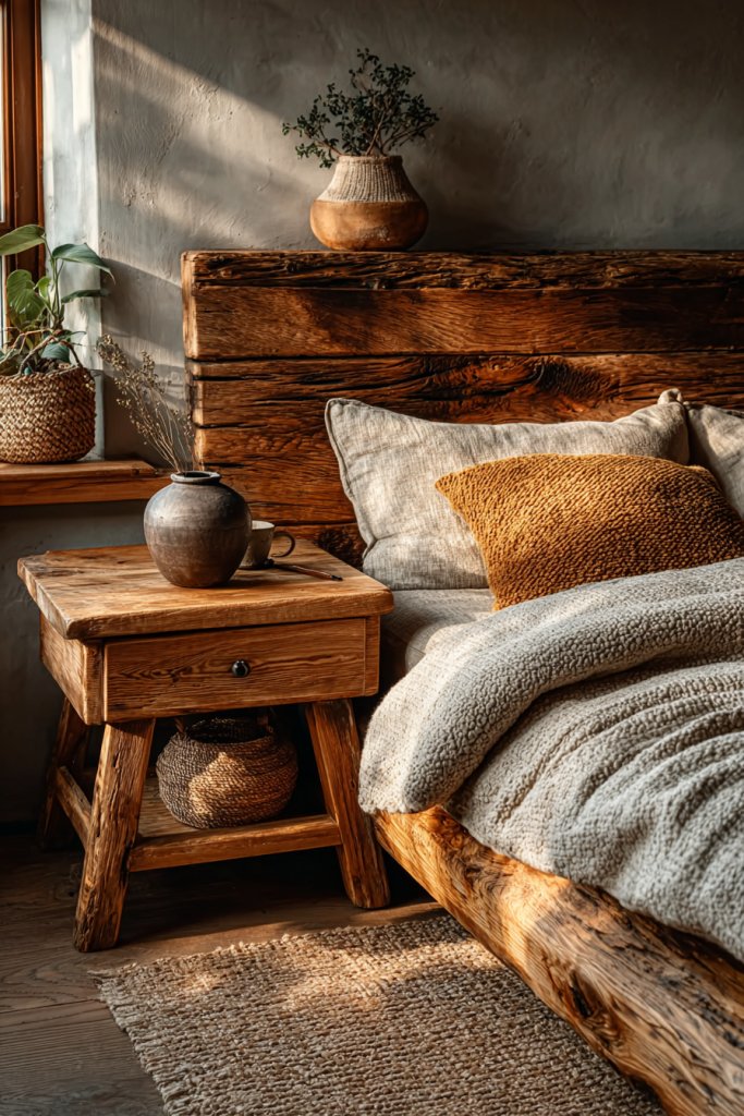 Picture a bed with a reclaimed wood headboard, its grain rich and textured. The warm tones of the wood contrast beautifully with soft bedding in neutral shades. A wooden side table or bench adds texture and practicality. Natural decor accents like wooden bowls or carved sculptures further deepen the organic feel.