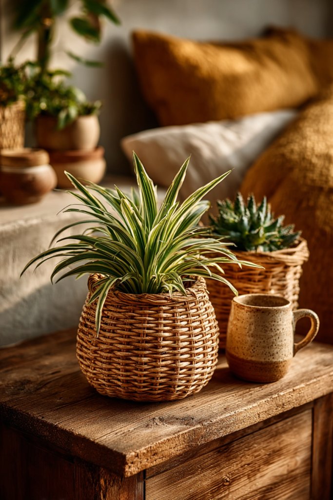 17. Add Small Indoor Plants in Wicker or Ceramic Pots (Optional)