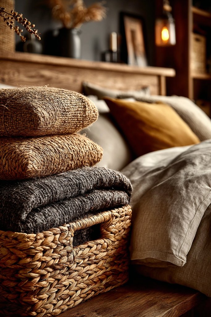 Choose woven baskets in neutral tones for storage or aesthetic accents. Place them in visible spots—under the bed, on shelves, or in corners. Use reclaimed or distressed wood furniture to maintain an authentic look. Incorporate natural textiles through bedding or curtains. Keep the space uncluttered to highlight textures.