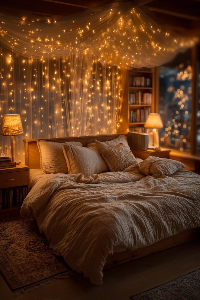 2. Incorporate Warm Ambient Lighting with String Lights or Bedside Lamps