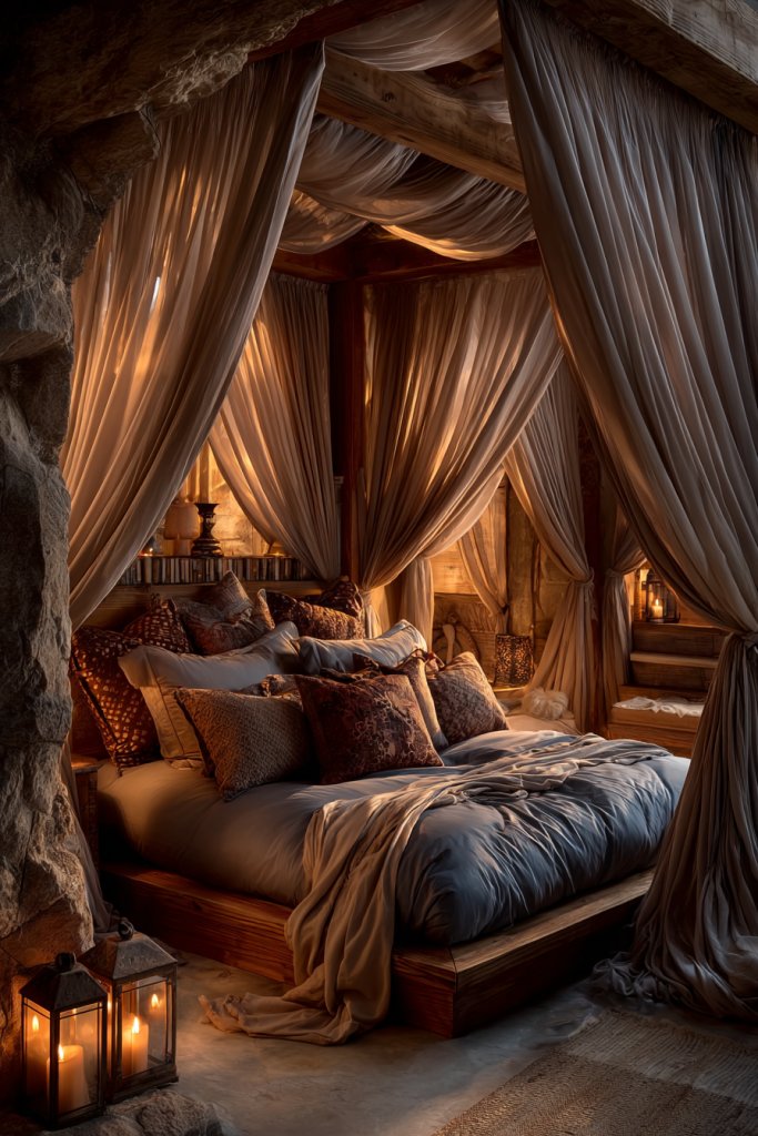 Imagine light, flowing fabric hanging from a ceiling-mounted frame or draped around a four-poster bed. The fabric in soft neutral or pastel shades adds a layer of softness and creates a cozy cocoon. When lit by warm lighting, it casts gentle shadows that transform the space into a dreamy sanctuary. The fabric movement adds a dynamic, inviting feel.