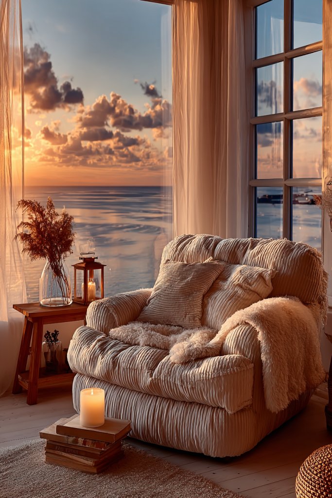 Picture a plush armchair in a soft fabric like boucle or velvet, nestled in a corner with a small side table nearby. A textured throw and a stack of favorite books complete the scene. Gentle lighting from a wall sconce or a small lamp makes it inviting. The space becomes a mini sanctuary that beckons you to relax.