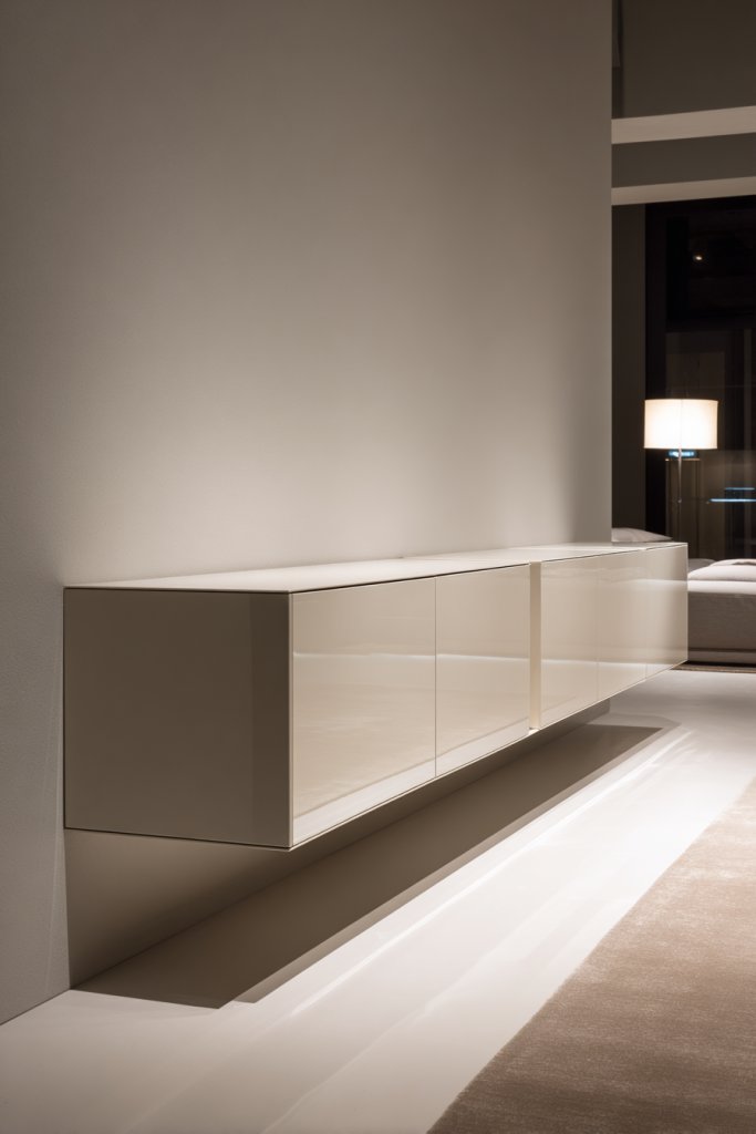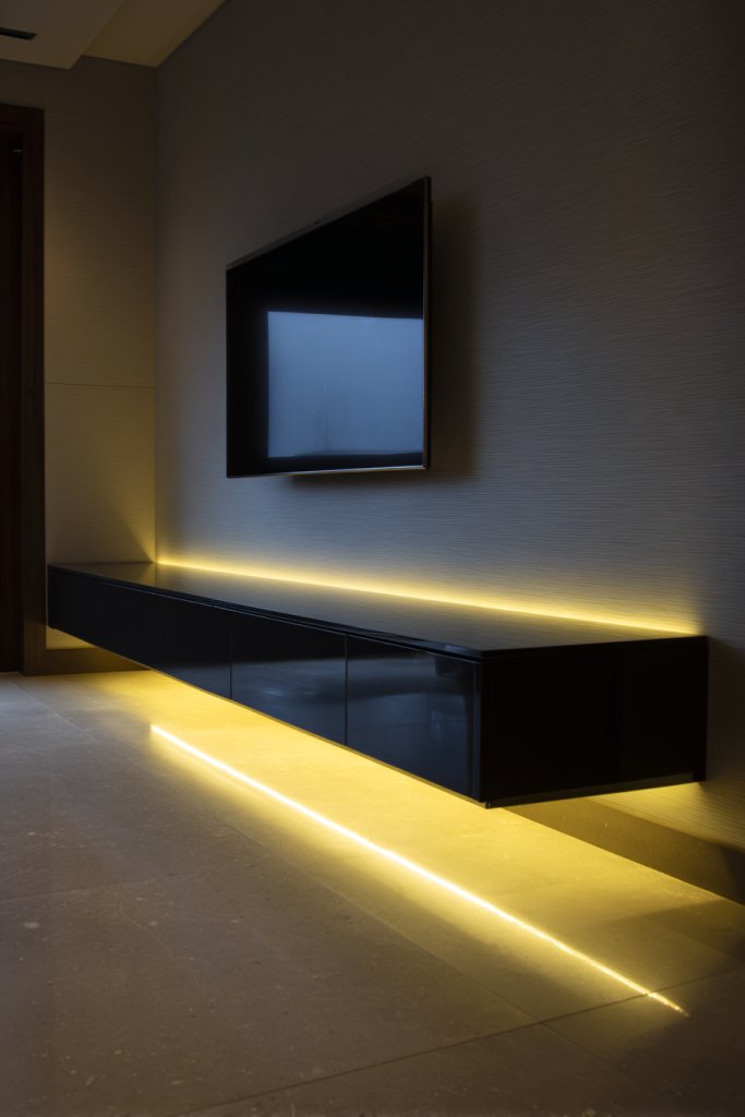 Choose finishes like matte black, gloss white, or natural wood veneer to match your decor. Incorporate a few minimalist accessories or decorative objects on top, avoiding clutter. The LED lighting can be customized with different colors or brightness levels, allowing you to set the perfect ambiance for movie nights or relaxed evenings.