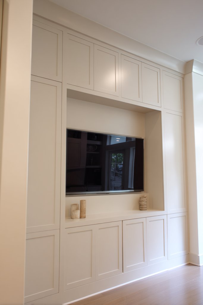 Visualize a recessed space carved into your wall, framed by matching cabinetry or molding. The niche provides a dedicated spot for your TV, with surrounding cabinets offering hidden storage for DVDs, remotes, or other media essentials. The clean lines and flush surfaces make the entire setup look like an intentional part of your home’s architecture. Soft lighting inside the niche highlights the TV, creating a cozy, theater-like effect.