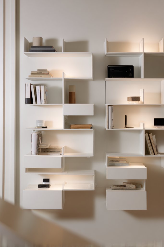 Imagine a sleek wall-mounted shelving unit with multiple open compartments. Each shelf features adjustable dividers that can be repositioned to accommodate different-sized items. The open design makes everything accessible and easy to reorganize, while the clean lines and neutral finish keep the look modern and versatile. It’s a functional gallery for your media essentials.