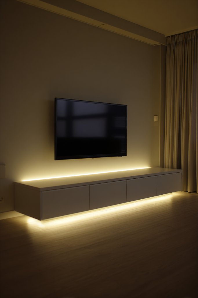 Wish your TV area looked more sophisticated without taking up too much space? A floating narrow console with under-glow LED lighting offers a sleek, modern solution that adds ambiance and style. It’s perfect for small rooms or anyone who loves a subtle, high-end look.