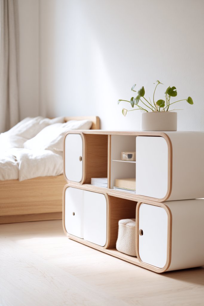 Use different wood tones like ash, birch, or beech to create varied visual effects. Add soft textiles nearby, like a plush rug or cushions, to enhance the cozy vibe. Incorporate modular shelving inserts or baskets for added organization. Adjust the size and configuration based on your room’s layout, from compact units to larger, multi-section setups.