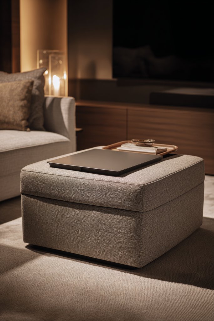Looking for a versatile piece that combines seating, storage, and TV support? A multi-functional ottoman with hidden storage and a built-in TV mount is the perfect all-in-one solution. It’s ideal for small spaces or multipurpose rooms where every inch counts.