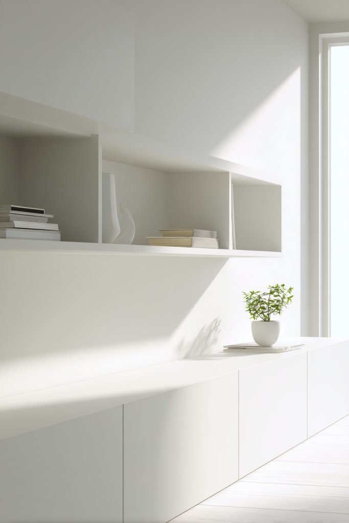 Visualize a sleek, matte white cabinet stretching across your wall, with open shelves breaking up the solid mass. The open sections allow you to showcase curated accessories or neatly stacked media devices, while hidden compartments keep cables and remotes out of sight. The bright white finish creates a sense of freshness and openness, making the room feel larger.