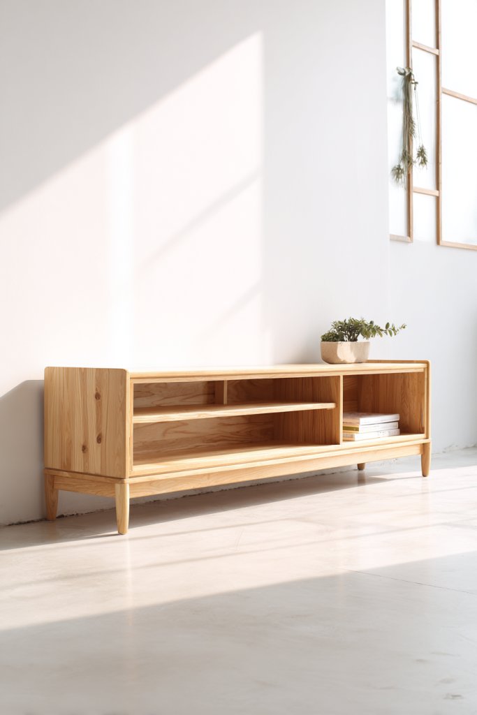Picture a slender, light-colored wood cabinet with open compartments that highlight the natural grain. The design emphasizes minimalism, with open shelving that allows for easy access and display. The console’s soft edges and simple hardware create a subtle aesthetic that complements almost any decor style. Ambient light from nearby windows enhances the natural warmth of the wood.