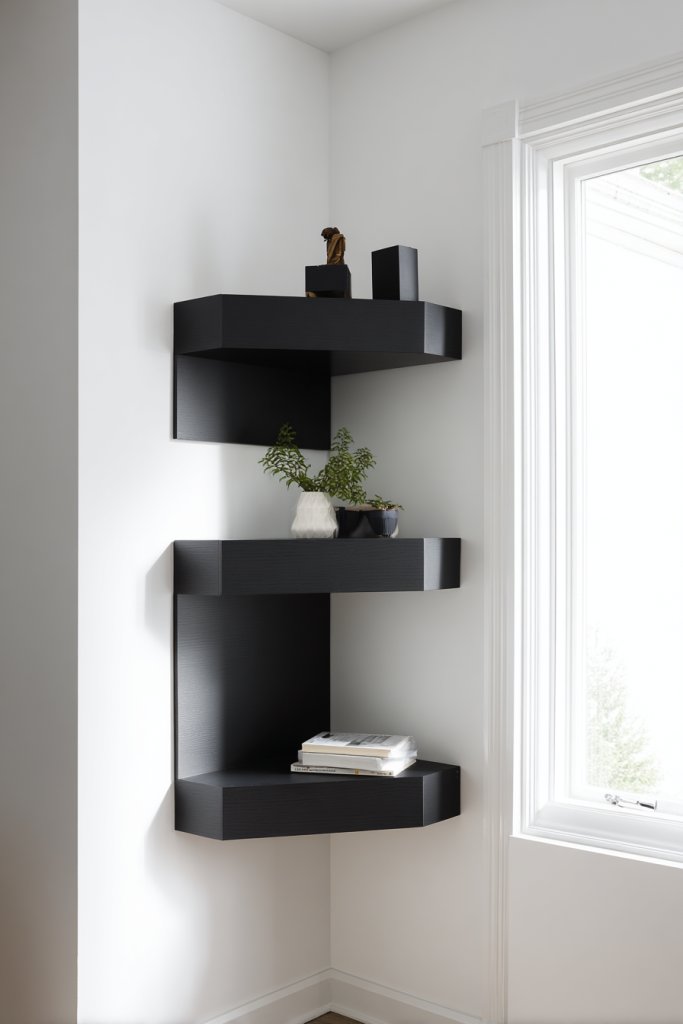 Choose a finish that matches your decor—white, black, or natural wood tones work well. Incorporate decorative boxes or baskets on the shelves for organization. For a more modern look, opt for floating glass or metal shelves instead of wood. This setup adapts easily to different room shapes and sizes.