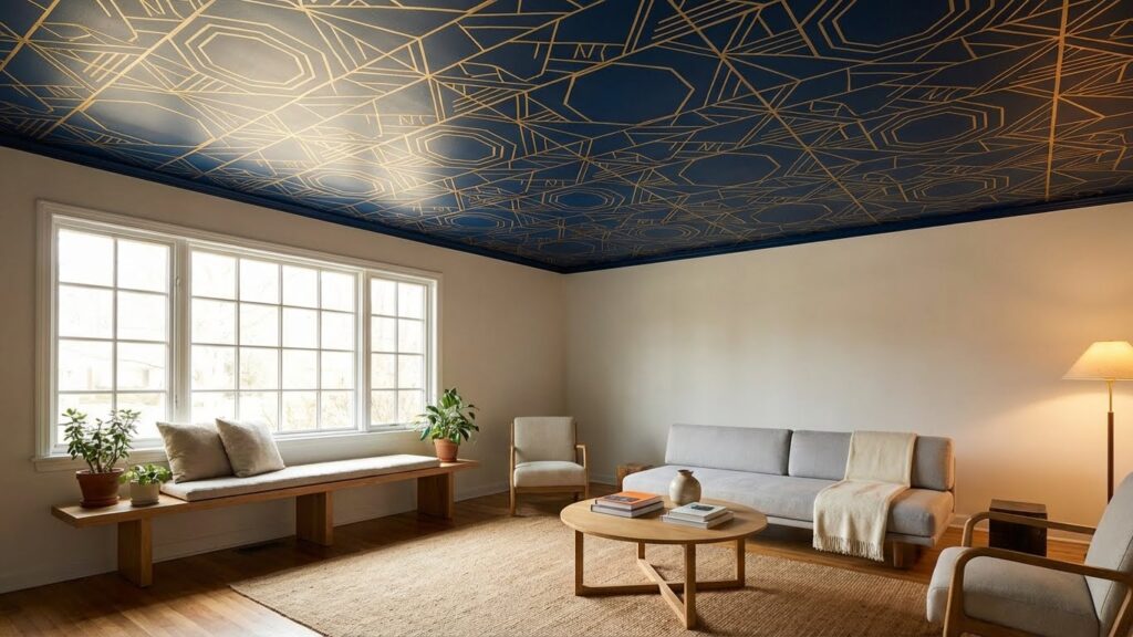 Geometric shapes or floral motifs work as a playful twist, particularly effective in modern homes. For classic styles, a subtle damask or soft-toned stenciling adds elegance without making guests feel like they walked into a Victorian museum. By decorating your ceiling, you’re not just enhancing your space. You’re making a statement that reflects your unique taste, and you’re giving people something to look at during awkward dinner party silences.
