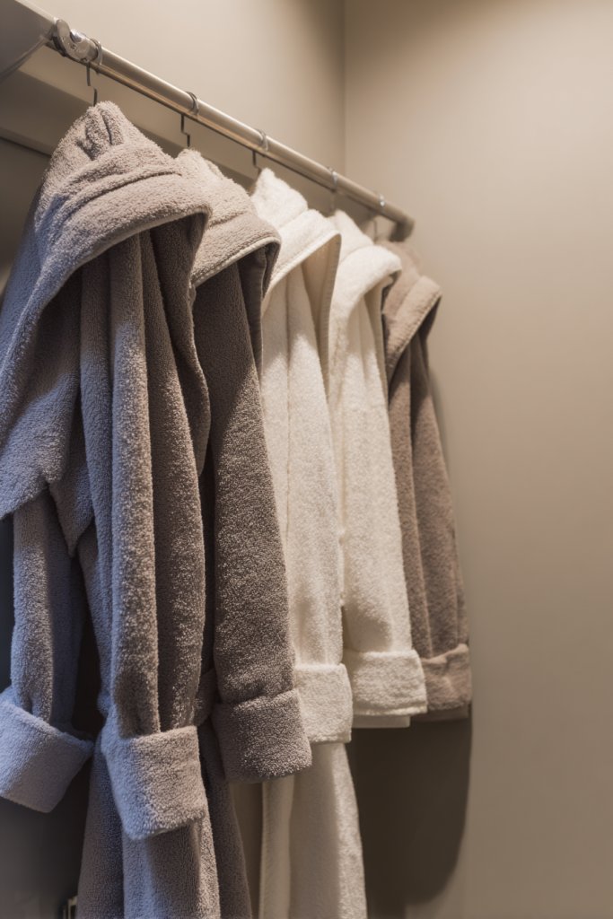 Add decorative trims or embroidery for a personalized touch. Use a towel rack with multiple bars for easy access and display. Incorporate a small shelf for skincare or bath essentials nearby. Personalize your robes with monograms or custom patches for a unique feel.