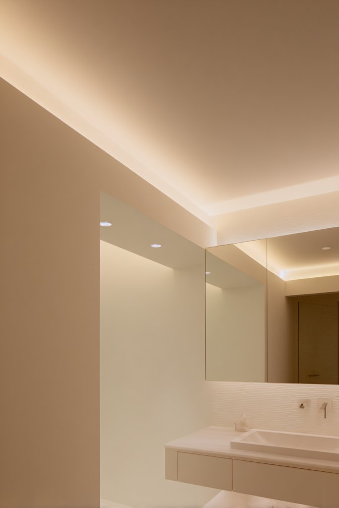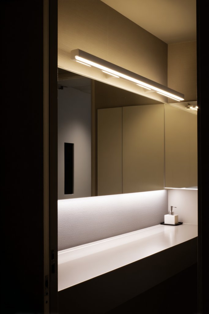 Imagine sleek sconces or strip lighting mounted just above or beside your mirror, emitting a warm, diffuse glow. The fixtures are minimal yet stylish, blending seamlessly with your decor. The light softly highlights your face, making makeup or shaving easier and more precise. The overall effect is a flattering, luxurious ambiance.