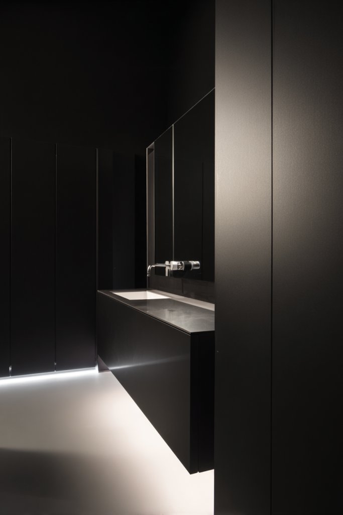Imagine a floating vanity with a matte finish, mounted seamlessly to the wall, leaving the floor visible and open. Concealed drawers and cabinets hide toiletries and essentials, maintaining a tidy look. Soft LED lighting underneath adds a subtle glow, accentuating the floating effect. The overall aesthetic is contemporary, uncluttered, and effortlessly stylish.