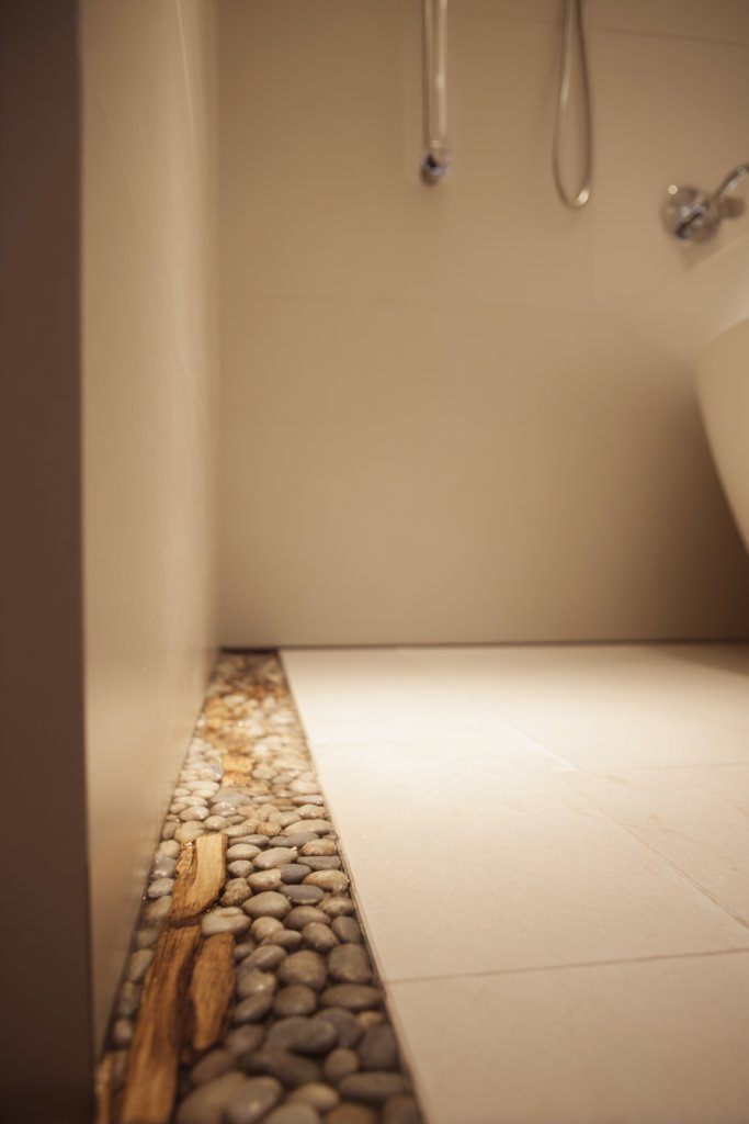 Use natural stone pebbles in the shower or as a decorative border in the main floor. Opt for engineered wood or waterproof wood-look tiles for durability and moisture resistance. Incorporate these accents in small areas for subtle charm or throughout the entire floor for a bold statement. Style them with neutral or earth-tone color schemes.