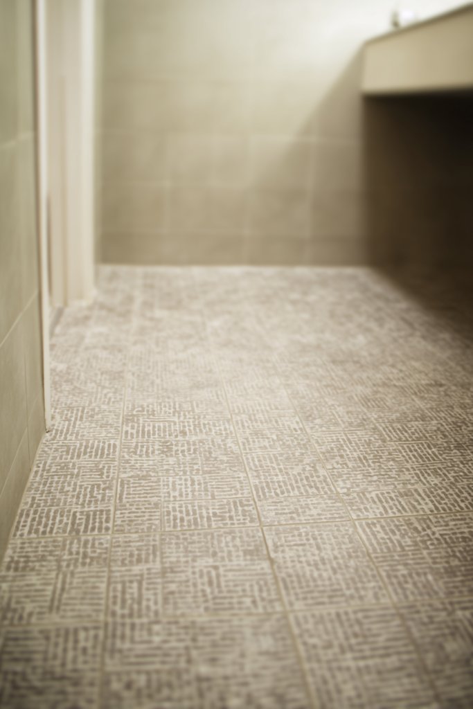 Imagine large-format tiles with soft embossed patterns or gentle textures in neutral tones. The textured surface catches light differently throughout the day, adding depth and dimension. The pattern is subtle enough to keep the environment serene but interesting enough to draw the eye. Combined with sleek fixtures and neutral walls, the floor becomes a design feature.