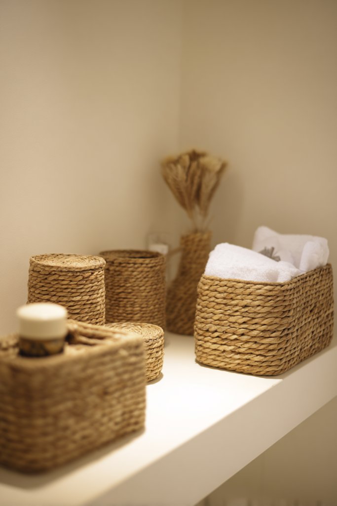Use different sizes and shapes for variety—small for toiletries, larger for linens or laundry. Coordinate with other natural accents, such as wooden trays or stone accessories. For a more refined look, choose baskets with leather handles or detailed weaving. They work well in both open shelving and hidden storage areas.