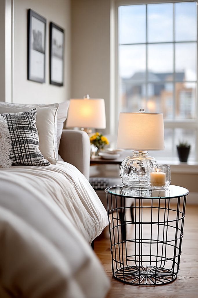 Start by selecting a nightstand with a sturdy wire frame and tempered glass top. Assemble the frame according to instructions, ensuring all joints are tight. Place the glass securely on the frame, checking for stability. Decorate with essential nighttime items—use minimal accessories to keep the look clean. Regularly clean the glass and dust the wire frame to maintain its sleek appearance.