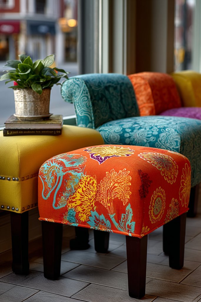 12. Brightly Colored Accent Stools with Patterned Upholstery