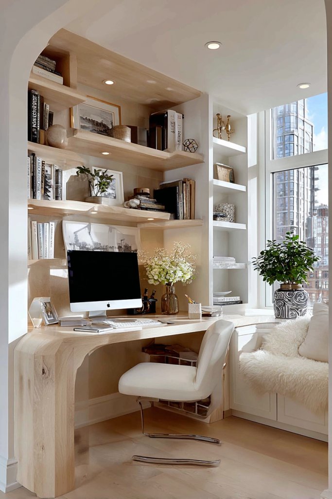 Imagine a sleek, L-shaped desk with a modern finish—light wood, matte black, or painted to match your decor. The built-in shelves above or beside provide dedicated storage for books, files, or decor. The design keeps clutter out of sight but within reach, creating an organized, inspiring workspace. It’s tailored to your needs, blending seamlessly into your room.