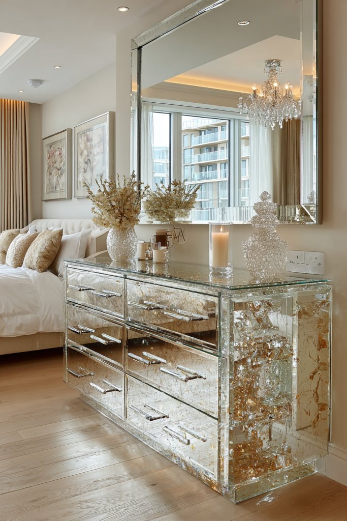 Add subtle decorative trims, or custom hardware to match your room’s accents. Incorporate soft lighting around the dresser for a glamourous glow. Use textured bedding or layered textiles to add warmth and depth. Keep the mirrored surface free of fingerprints for a pristine, high-end appearance.