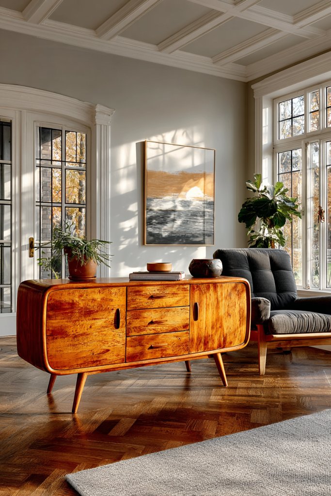 Opt for darker woods for a more dramatic look, or lighter finishes for a breezy, Scandinavian feel. Incorporate brass or matte black hardware for contemporary accents. Use in open-concept spaces or as a statement piece against a textured wall. Decorate with vintage vases, framed photos, or textiles to complement the retro vibe, avoiding wall art as per restrictions.