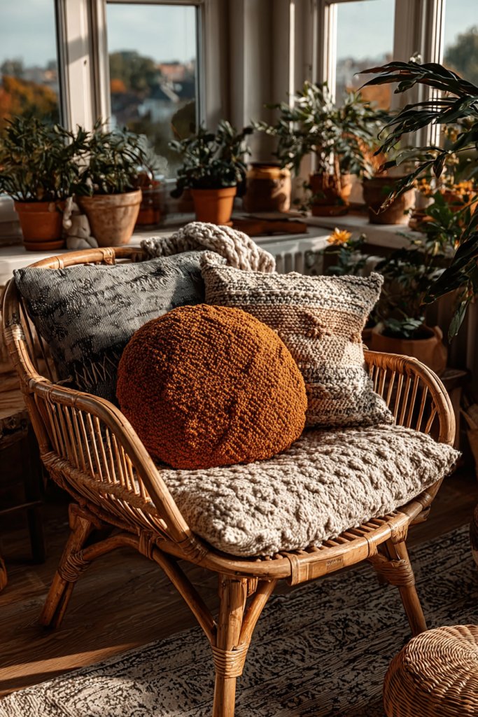 Visualize a woven rattan chair with a slightly curved back and armrests, paired with a plush cushion in earthy tones or vibrant patterns. The natural material adds organic texture, while the cushions provide comfort and pop of color. Place it near a window or in a cozy corner, layered with throws or rugs for a layered, boho aesthetic. It’s a versatile piece that radiates relaxed elegance.