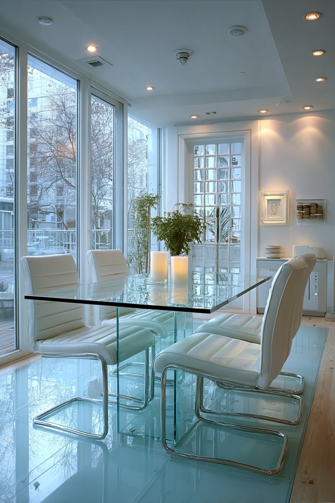 Imagine a polished tempered glass tabletop supported by slender metal legs—matte black, brushed brass, or chrome—giving an airy, minimalist look. The transparent surface showcases your table setting and adds brightness to the room. Use minimalistic chairs with sleek lines to match the overall contemporary aesthetic. It’s a balanced combination of transparency and industrial chic.