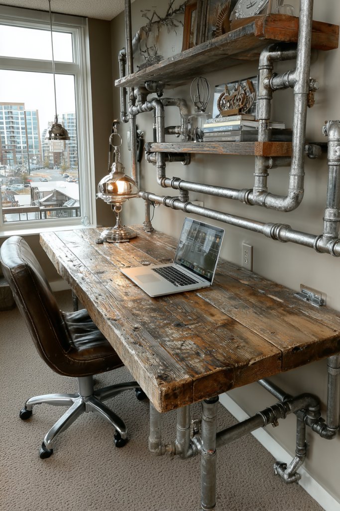 Picture a desk with a raw steel pipe frame supporting a reclaimed wood or metal surface. The exposed piping adds an architectural element, while the spacious tabletop provides ample room for your laptop, monitor, and accessories. Pair it with a leather or fabric task chair to complete the industrial look. The open design creates a sense of space and openness, ideal for a home office.