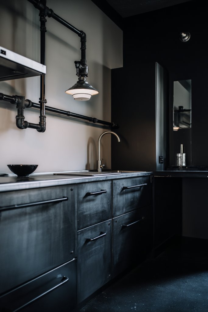 11. Modern Industrial Vibe with Metal Accents and IKEA Cabinets