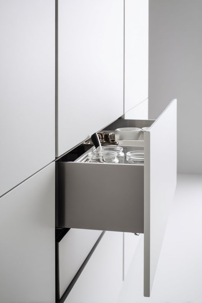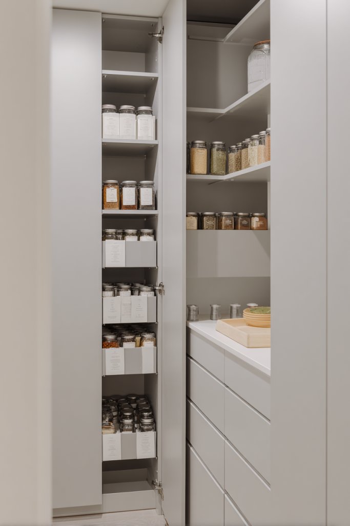 Use pull-out systems for various items—pantry shelves, cleaning supplies, or cookware. Choose between full-extension drawers or specialized pull-outs for spices, cutlery, or trash. Customize the interior with dividers, baskets, or labeled containers for maximum efficiency. Adapt the system based on your space—corner cabinets, under-sink storage, or tall pantry units are all perfect candidates.