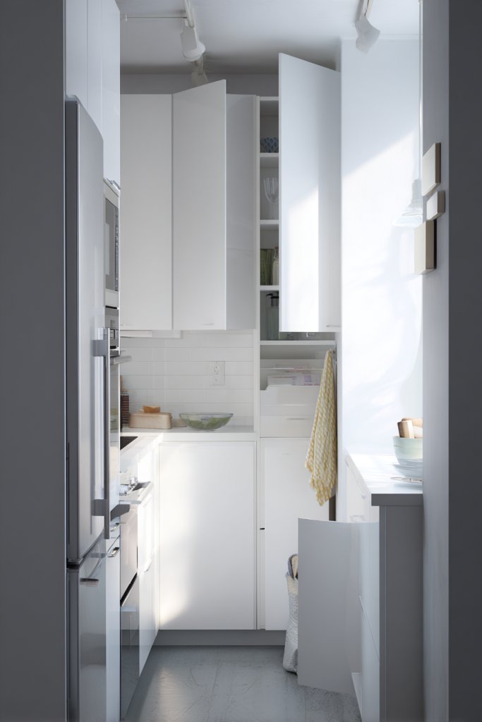 Imagine a galley kitchen with tall, slim cabinets stretching from floor to ceiling, providing ample storage without crowding the space. The sleek, handleless doors open smoothly, revealing organized shelves and drawers. A small island or fold-down table serves as prep space and dining area. The light-colored cabinetry reflects natural light, making the room feel open and airy.