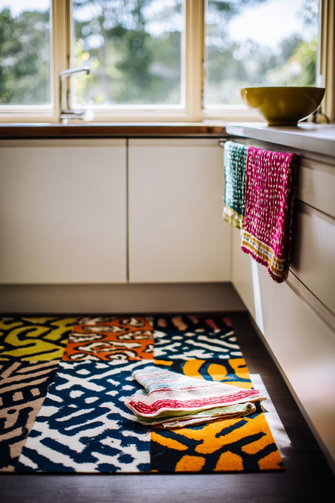 Imagine a soft cream or neutral-toned floor with a patterned rug featuring geometric or floral motifs in vibrant colors. The textiles on your chairs or curtains echo these patterns, creating harmony. Dish towels and oven mitts showcase playful prints, while a cozy, textured rug anchors the space. The combination makes the kitchen feel lively, inviting, and full of personality.