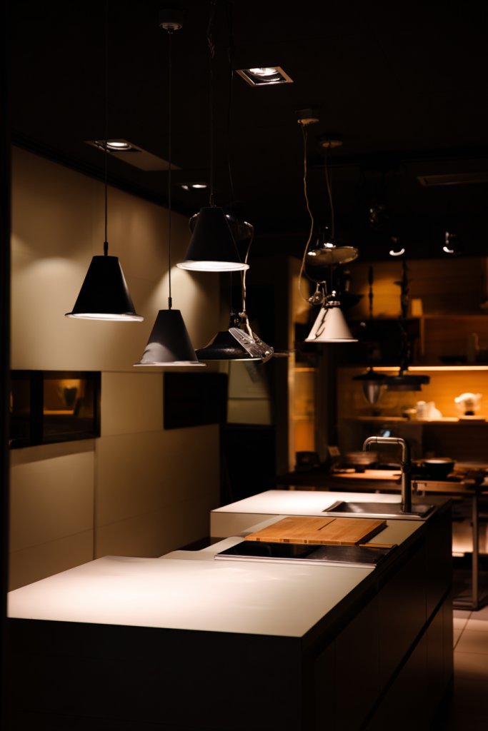 Visualize a cluster of pendant lights hanging over an island, casting warm pools of light. Spotlights highlight artwork, architectural features, or a beautiful backsplash, drawing attention to your design details. The lighting fixtures in matte black or metallic finishes add a modern touch. The overall effect is cozy yet functional, with layered lighting creating depth and ambiance.
