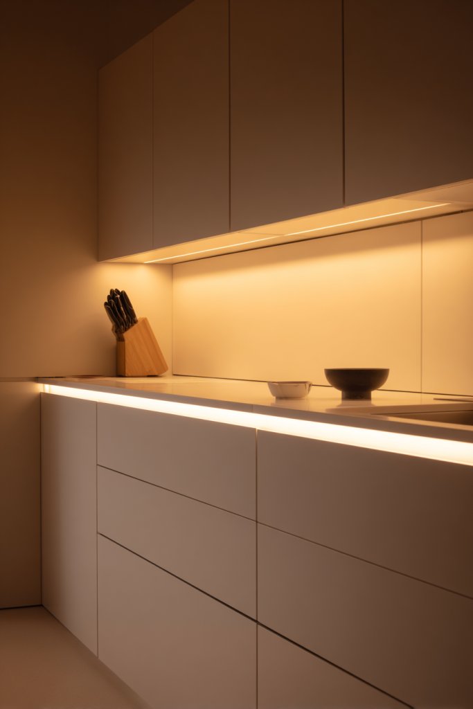 Imagine sleek LED strips installed beneath your upper cabinets, casting a soft, even light over your countertop. The light highlights your workspace without creating shadows or glare. The warm tone of the LEDs complements your decor, making everything look more appealing. You can see the texture of your cutting board and the sparkle in your utensil holder, making your kitchen feel welcoming and efficient.