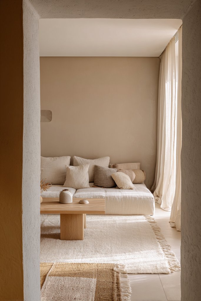 Picture a living room painted in soft beige, accented with warm taupe and gentle browns. The walls evoke a sense of calm, while textured textiles in similar hues add depth. Natural wood furniture with light finishes complements this palette, reflecting sunlight and enhancing the cozy atmosphere. The overall scene feels warm and inviting, encouraging relaxation at every glance.