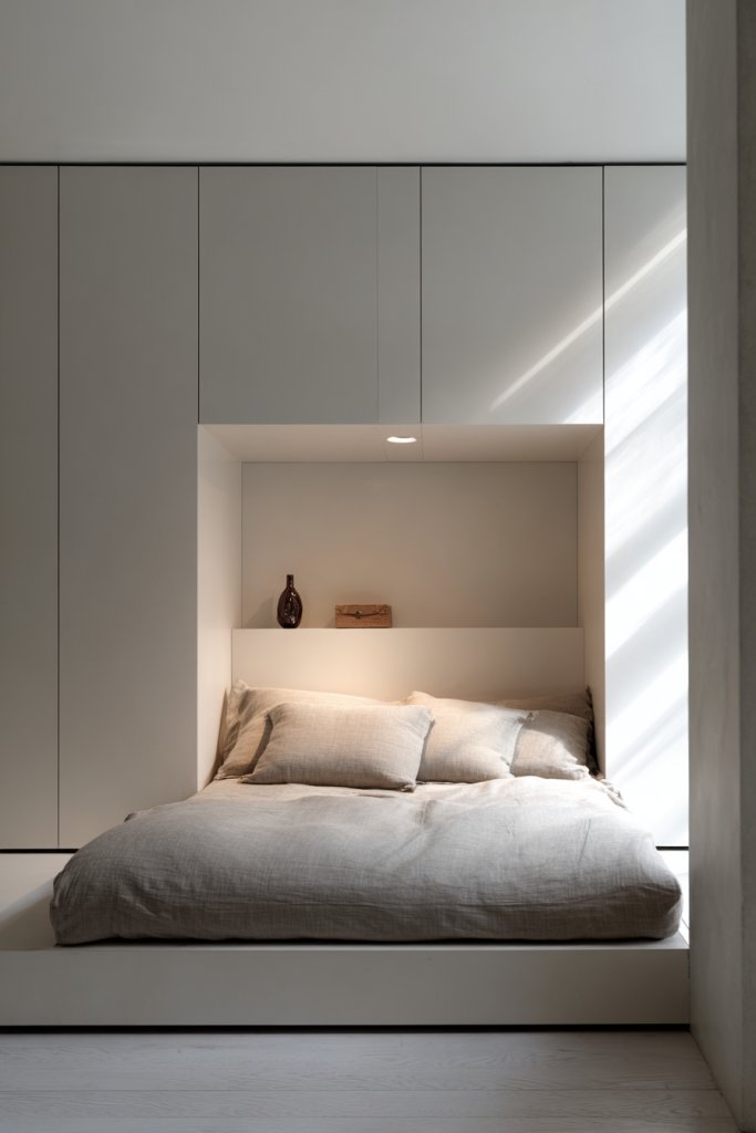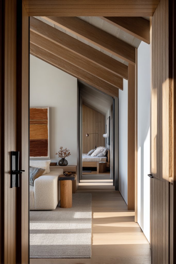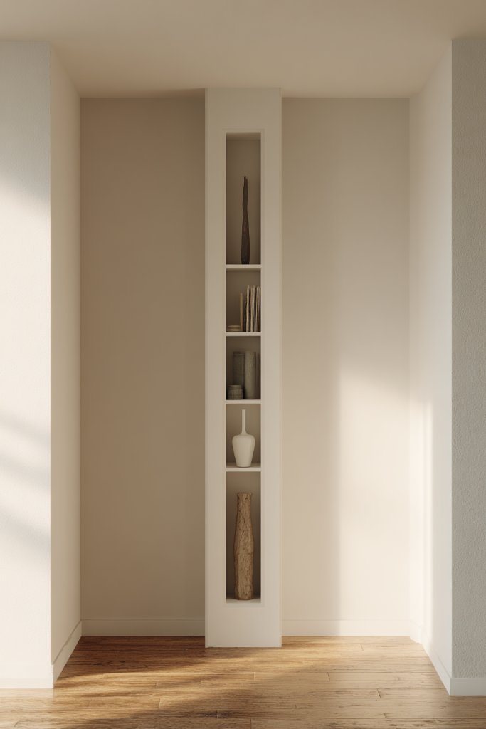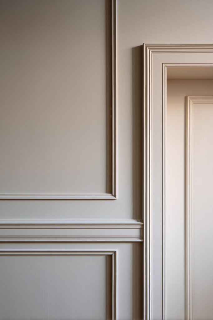 Visualize a wall with a recessed section that creates a nook for built-in storage or lighting. Beveled edges on door frames or wall panels catch the light softly, adding dimension. The interplay of shadows and light highlights the craftsmanship, giving the space a refined, crafted feel. These details serve as quiet focal points that enrich the overall harmony.