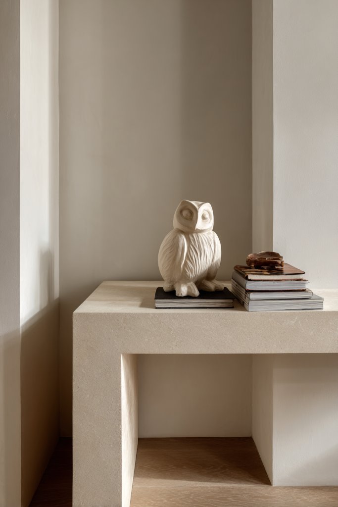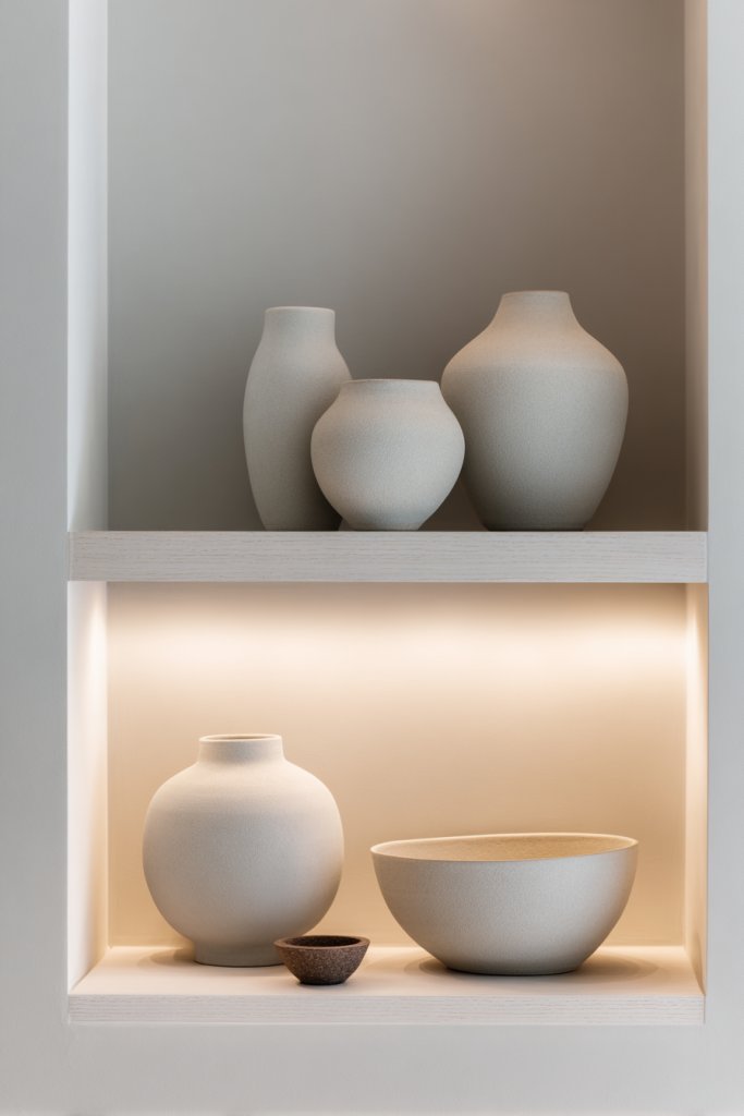 Visualize a clean, open shelf with just a few carefully selected items—perhaps a handcrafted ceramic bowl, a textured sculpture, or a simple candle. Each piece is meaningful, with ample space around it to breathe. The overall look is calm and curated, showing that restraint and quality create a luxurious feel.