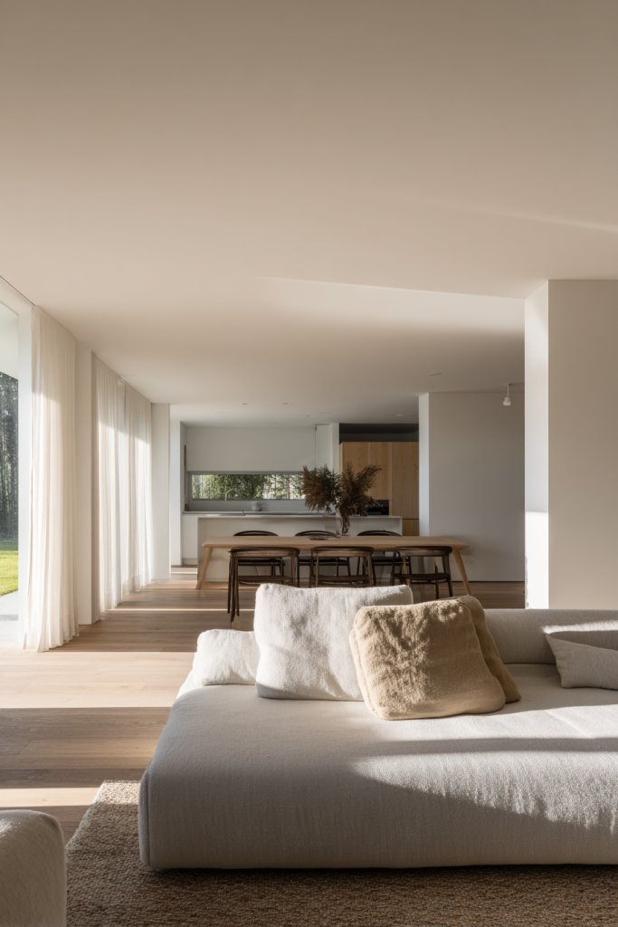 Opt for sheer or linen curtains in muted shades to maintain openness while adding softness. For colder months, paired with thermal or blackout curtains, you can control light and temperature. In smaller rooms, consider installing large, removable panels to maximize openness. For a cozy winter feel, layer with textured textiles or add a fireplace that complements the light-filled ambiance.
