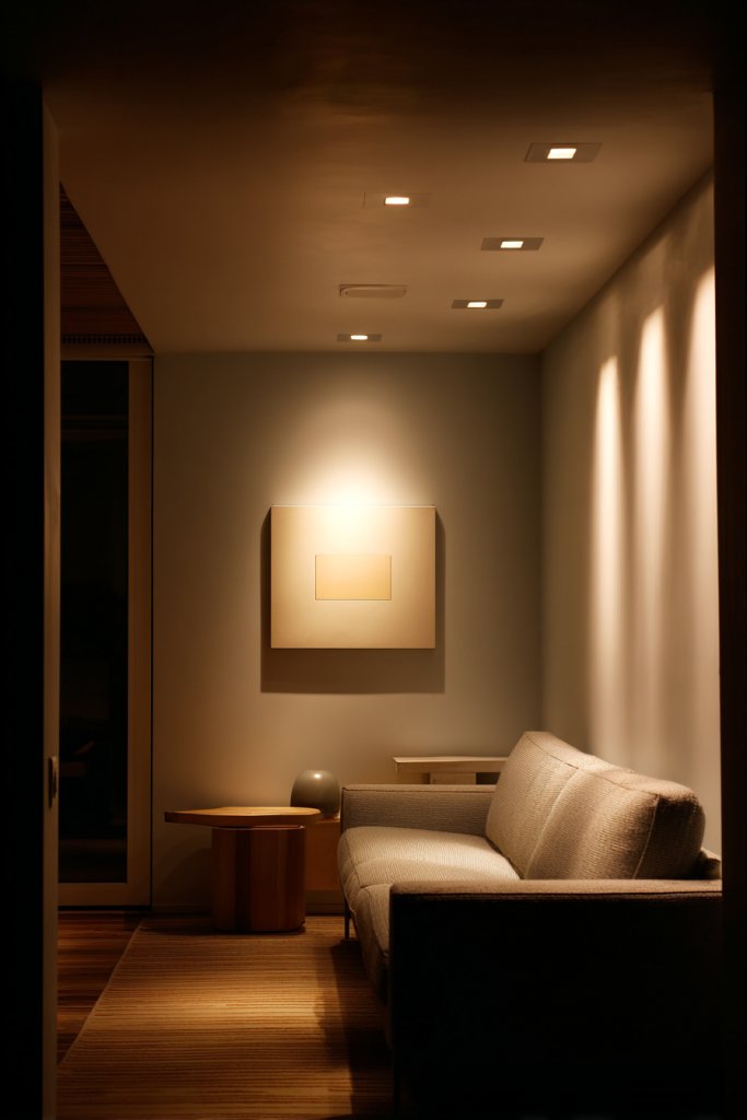Imagine soft, warm recessed lighting installed in the ceiling to provide overall illumination. Accent lights highlight architectural features or textured walls, while a couple of discreet wall sconces add a gentle glow. The layers work together to produce a balanced, inviting atmosphere that adapts to different moods or activities. The room feels warm, intimate, and thoughtfully designed.