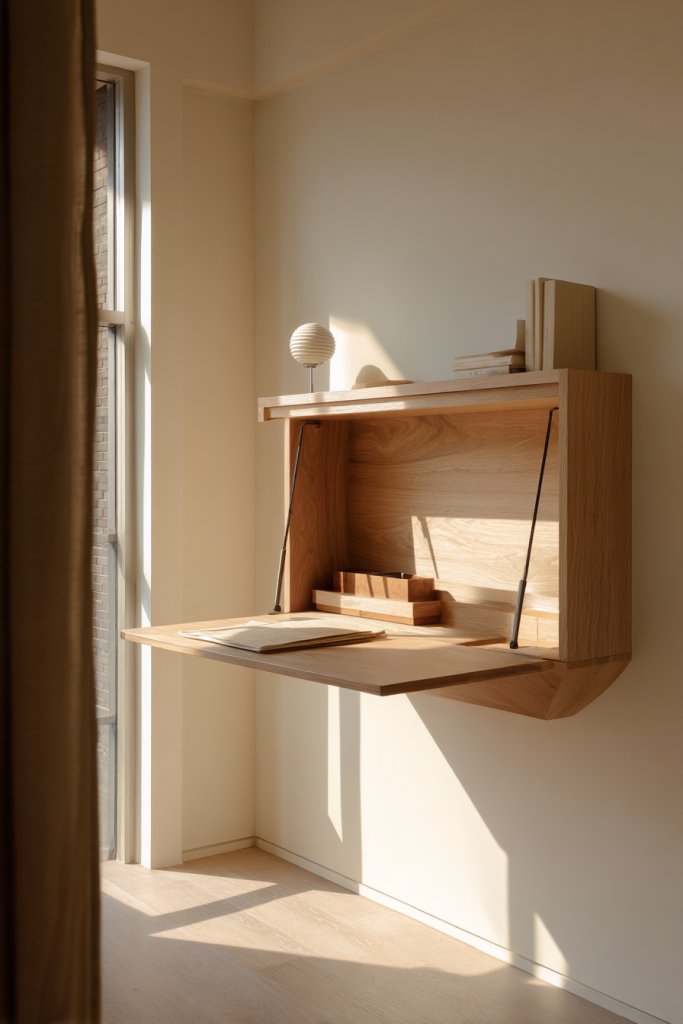 Visualize a slim, wall-mounted desk in a neutral tone, seamlessly integrated into a corner or under a window. It folds down when needed and disappears when not in use, keeping the area open and uncluttered. The design complements the minimalist decor, with clean lines and hidden hardware. It’s a functional area that doesn’t compromise style.